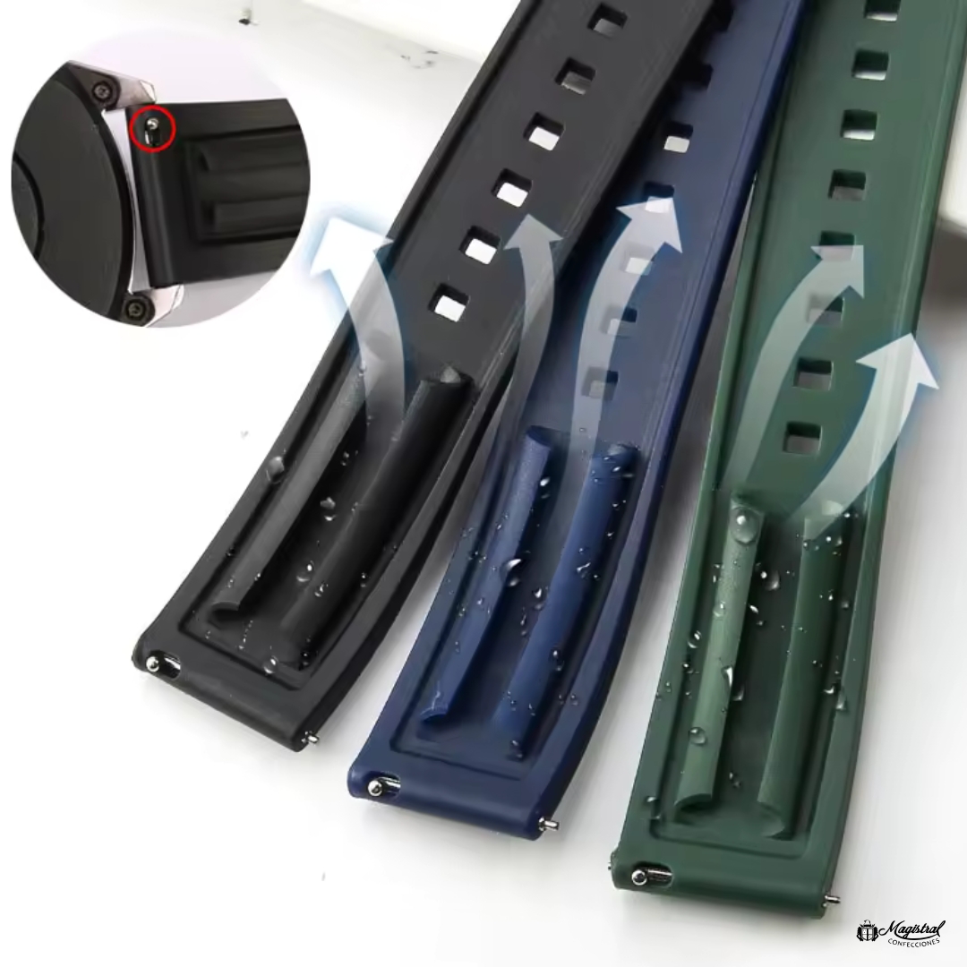 La Goma es de alta calidad, con un patrón de escamas bien definido que añade un toque de lujo. Los orificios de ajuste están distribuidos de manera uniforme y precisa, asegurando un ajuste cómodo y seguro en la muñeca.