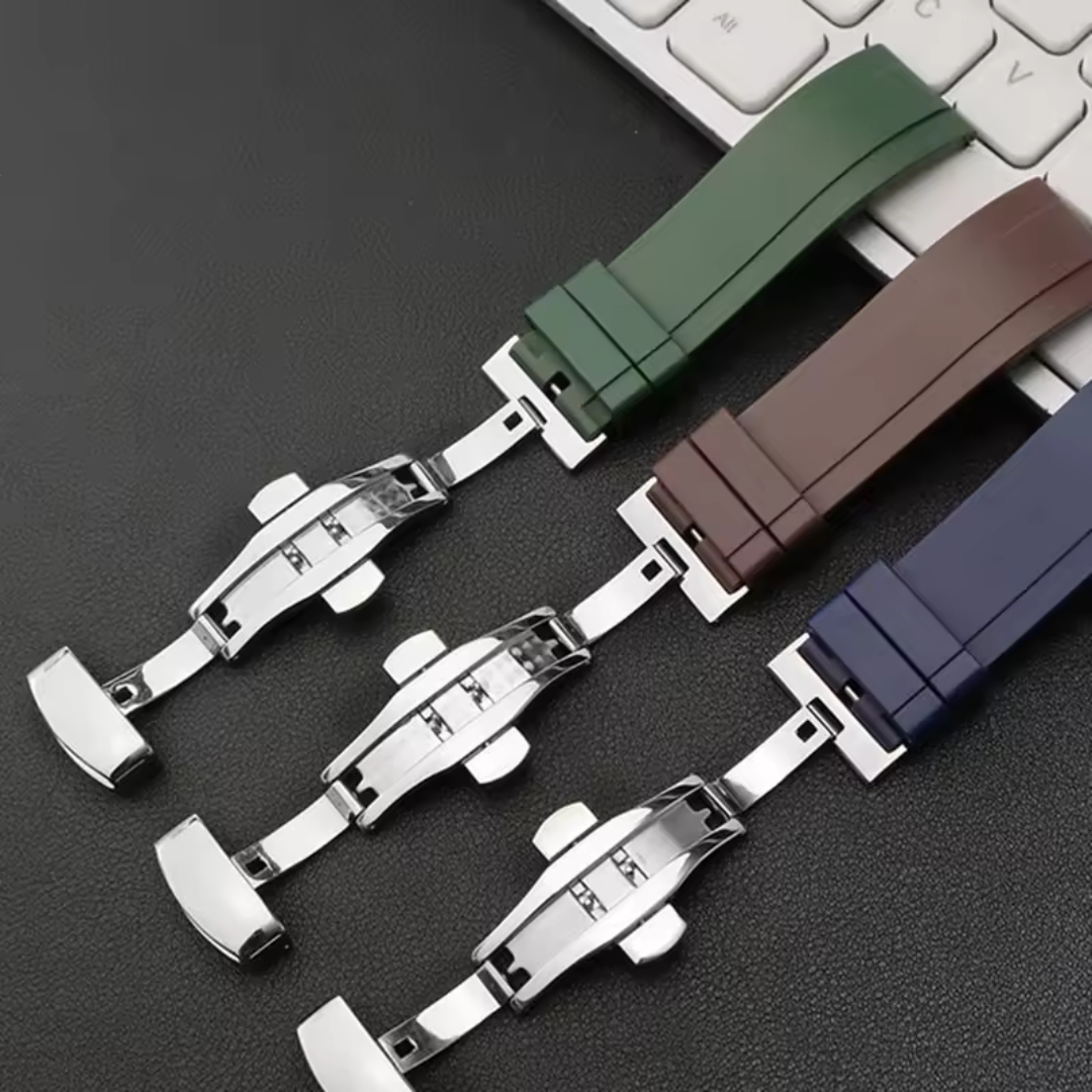 Esta malla para reloj está confeccionada en Goma que le aporta un estilo elegante y sofisticado. La correa incorpora una hebilla metálica plateada de diseño clásico, con un acabado pulido que complementa perfectamente el look general.